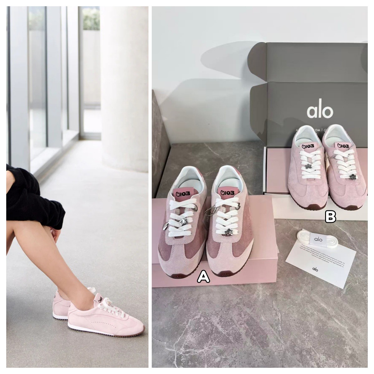 1230 Alo X Jisoo Bloom Pink 麂皮運動鞋 全套原標原盒 2月中 截單日期:12月30日 到貨日期:預計2月中 💲829 以流暢低筒👟 輪廓為核心,鞋楦弧度按腳背成型,包裹性滿分🤗 鞋帶星型小掛飾⭐ 可愛shumon化身,鞋標隱藏103生日🎂 數字;TPU立體Logo細膩有型,綁帶調整鬆緊剛好🔗進口A級麂皮霧面🌸 粉色,觸感細膩🌬️ 透氣,耐磨抗汙🛡️,輕量化單鞋僅三顆雞蛋重。回彈泡棉鞋墊,高性🛡️ 能減震,雲端☁️ 踩踏感,TPU支撐立體💪 輕量🚫 橡膠大底,防滑耐磨💧,拉長📏 腿線,弧度成型更貼合腳背👣 無論搭配短裙👗 襪子或長褲👖,都能輕鬆展現Alo的都市🏙️ 優雅,從🏃‍♀️ 慢跑到咖啡廳☕,一鞋切換甜美🍬 氣場❗ 🌈顔色: A 玫粉拼接 B 粉色 📐尺寸:35-40碼 🌸材質 :麂皮 聲明: * 貨品為平行進口貨/outlet貨,非專賣店購入,請介意者慎重考慮。 * 人手量度有機會1-3cm左右誤差屬正常 * 顏色可能會因網頁呈現與拍攝關係產生色差,圖片僅供參考,實物為準。